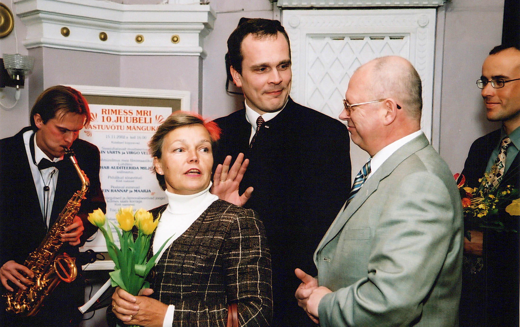 When Rimess MRI celebrated its 10th anniversary, the queue of well-wishers stretched from the Russian Theatre’s lobby out to the street. One of the founders of Hansapank, Andres Saame (wearing the grey suit), gives a gift to Eva Veinberg.