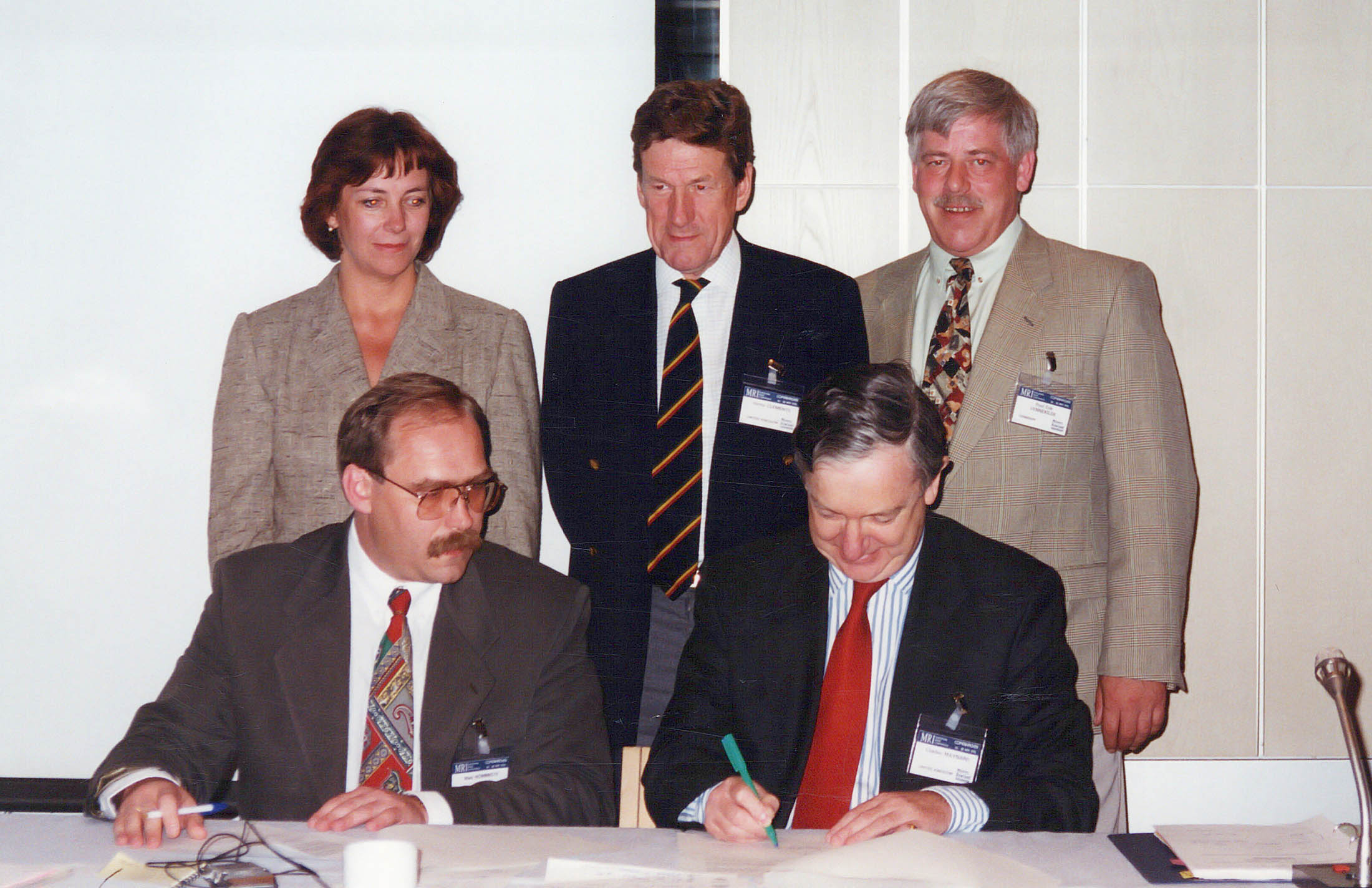 Rimessi ja MRI liikmeslepingu all kirjastamine 1995. aasta mais: istuvad (vasakult) Mati Nõmmiste ja MRI juht Charles Maynard. Tagumises reas Eva Veinberg ning MRI esindajad Victor Clements ja Poul Erik Vennekilde.