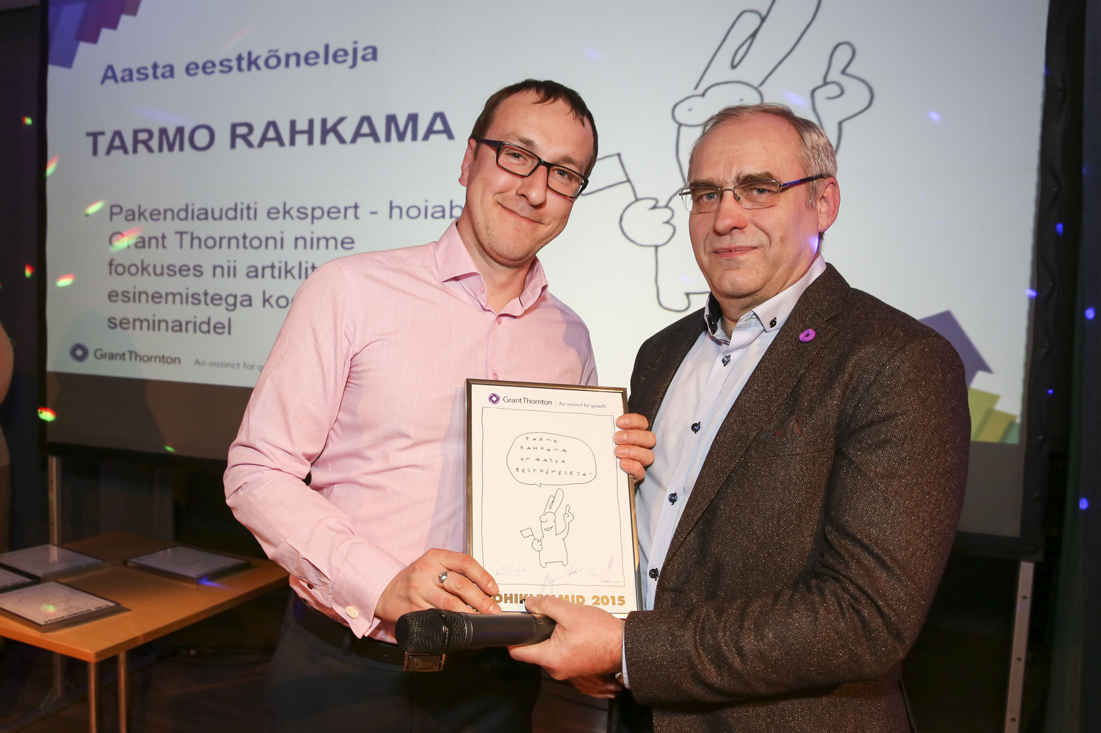 Vandeaudiitor ja partner Tarmo Rahkama (vasakul) on ühtlasi pakendiauditi ekspert ja sai 2015. aastal selle eest aasta eestkõneleja tiitli. Fotol koos Mati Nõmmistega kirjanike majas toimunud jõulupeol.