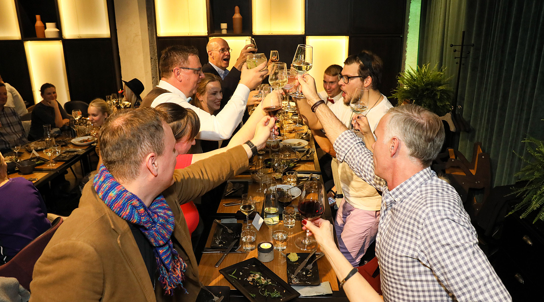 Manager’ide konverentsi pidu Tallinnas restoranis Korsten Kitchen aastal 2018. Parasjagu tõstetakse klaase traditsioonilise oo-hüüde saatel, parim on loomulikult laudkond, kes hüüab kõige kõvemini.
